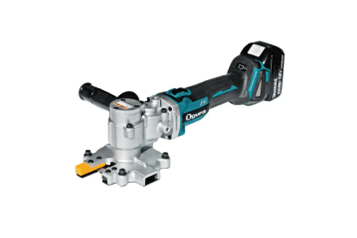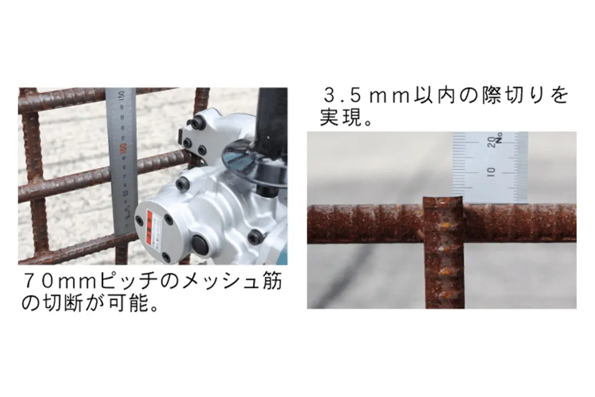 ・D25チップソーカッター。 ・オリジナルチップソーに強固な変則トリプルピン方式を採用し、フランジなしなのに安定した切断性能。 ・ユーザーフレンドリーな装着性(誤装着防止機能付き)を実現。 ・コードレスタイプなのにAC100V機並みのハイパワー化を実現した、新型ブラシレスモーター搭載。 ・モーター部には「防滴・防じん」ボディ+容易に清掃可能な脱着式ダストカバーを使用。 ・モーター部に視認性の高いバッテリ残量表示ランプと、自動変速表示ランプを搭載。 ・差し筋や枠組み鉄筋の開口部を、ツラおよび際から3.5mmで切断可能。 ・直角切アダプターセットとの併用で鉄筋継手工事にも最適。